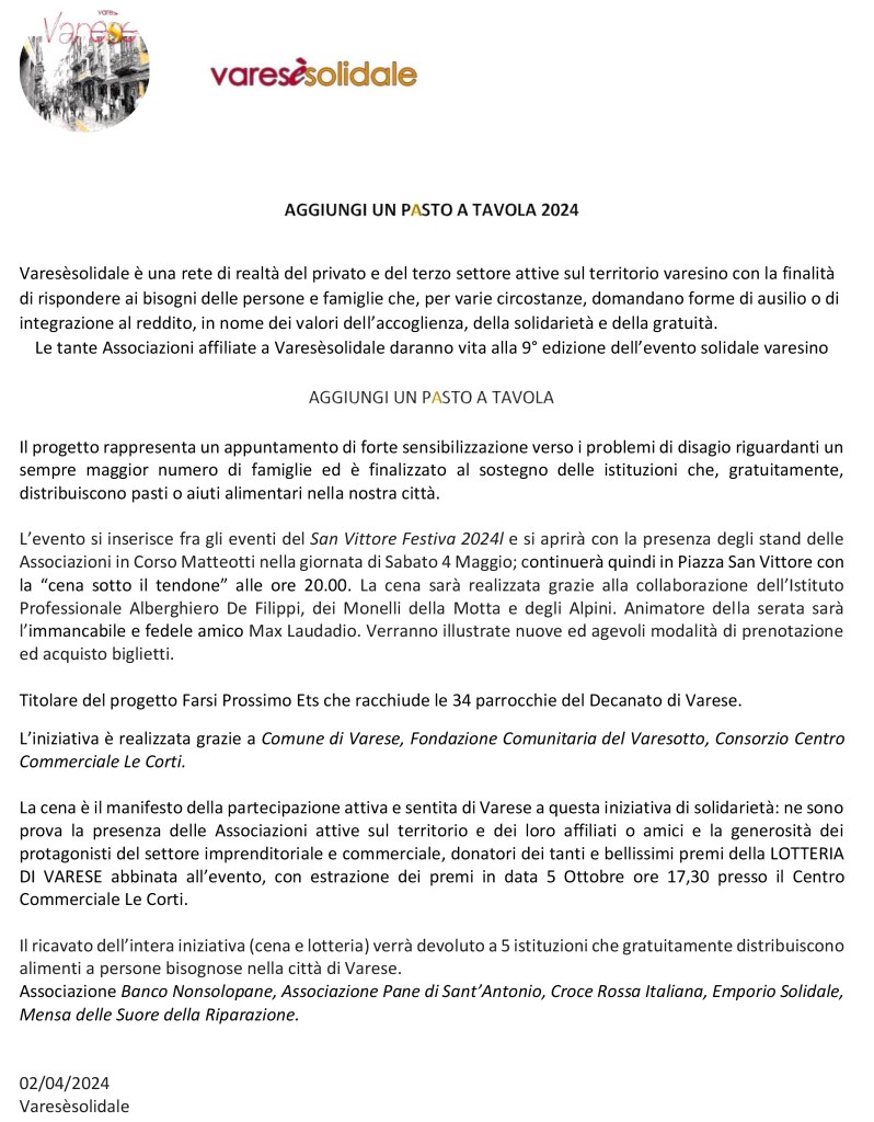 Posted on 6 aprile 2024COMUNICATO STAMPA 2024 Varese Solidale: il 4 maggio la cena in piazza per chi è meno fortunato Nona edizione per VaresèSolidale, il 4 maggio la grande cena in piazza per regalare un pasto a chi ha fame https://www.varesenoi.it/2024/04/05/leggi-notizia/argomenti/varese/articolo/torna-aggiungi-un-posto-a-tavola-lappuntamento-che-fa-del-bene-alla-varese-che-fa-del-bene.html https://www.rete55.it/notizie/sociale/varese-giornata-e-cena-solidali-al-via-la-nona-edizione